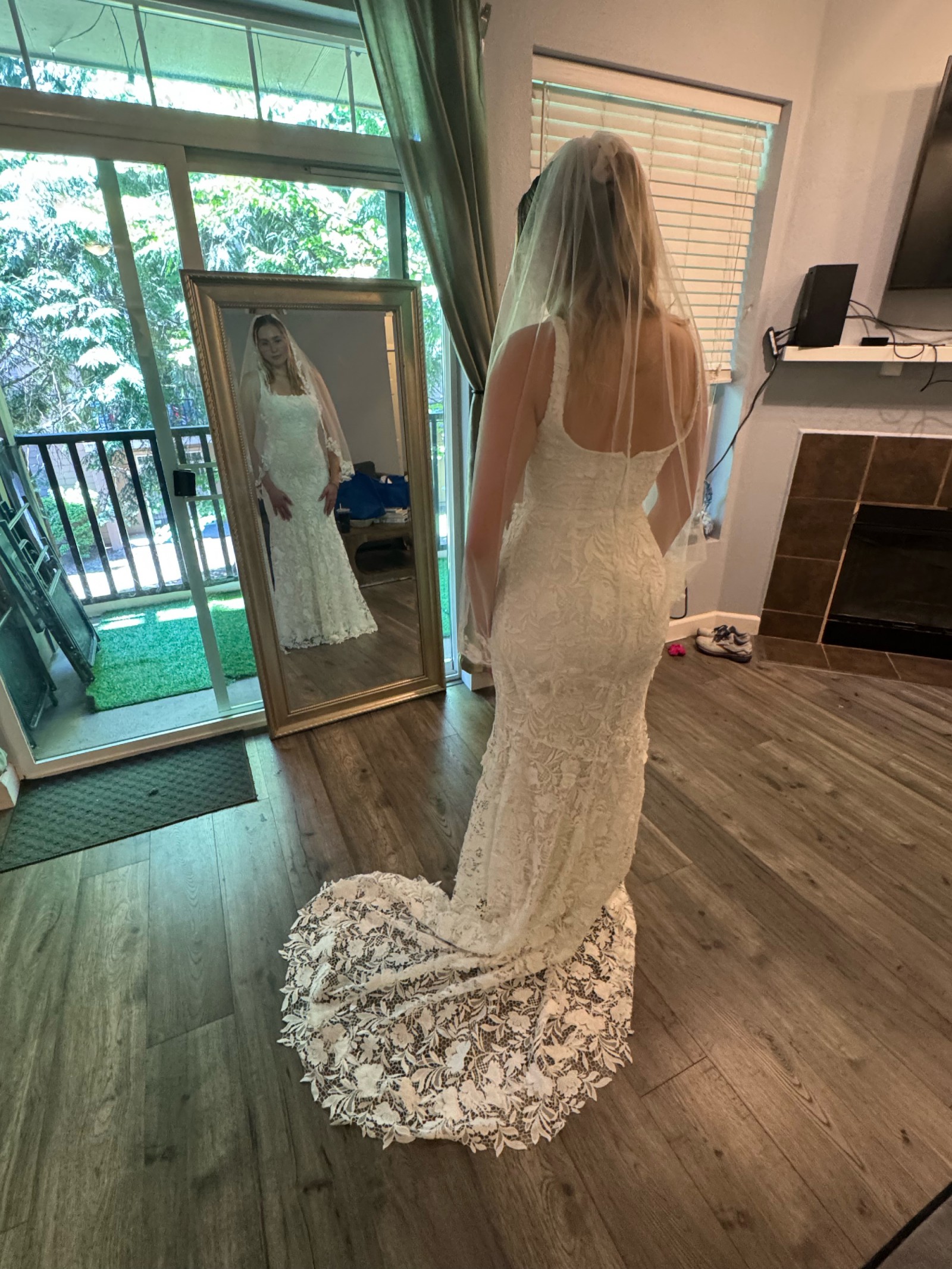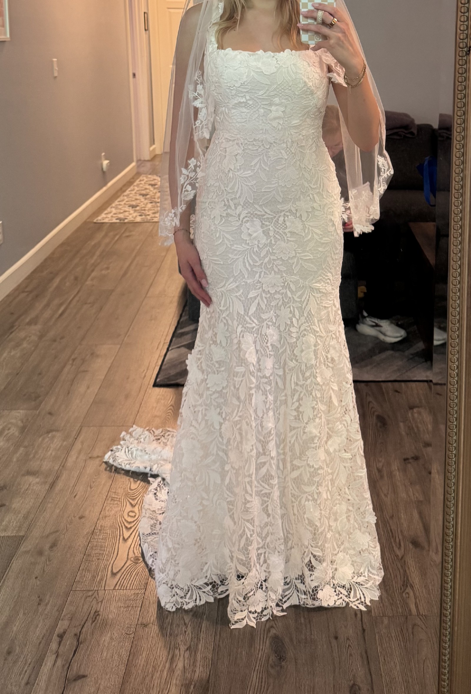 Bought for my wedding but ended up going with another dress. Only tried on! Size 6, no alterations.