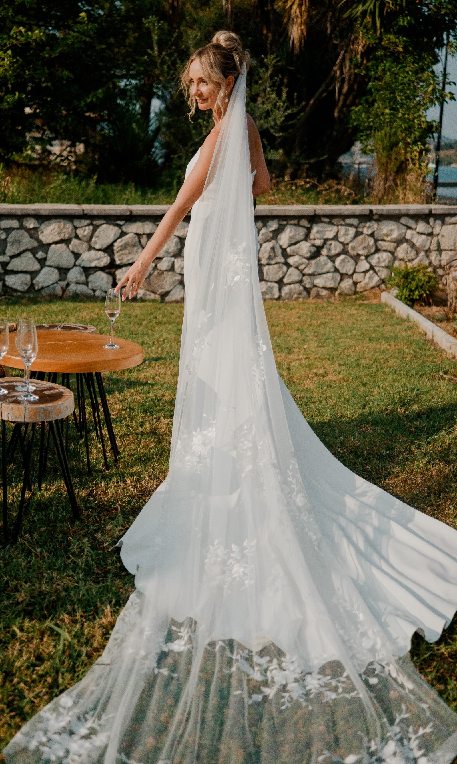Lily boasts a show-stopping long train, cascading from her flattering godet to add the perfect touch of elegance and drama to her overall design. Her bodice was intricately designed to drape delicately over the bust and add an element of femininity and softness to her otherwise classic silhouette.