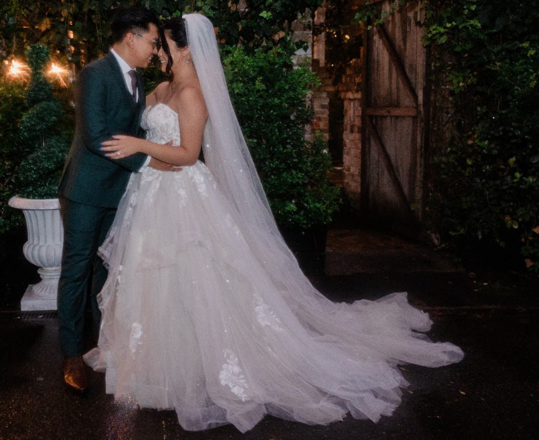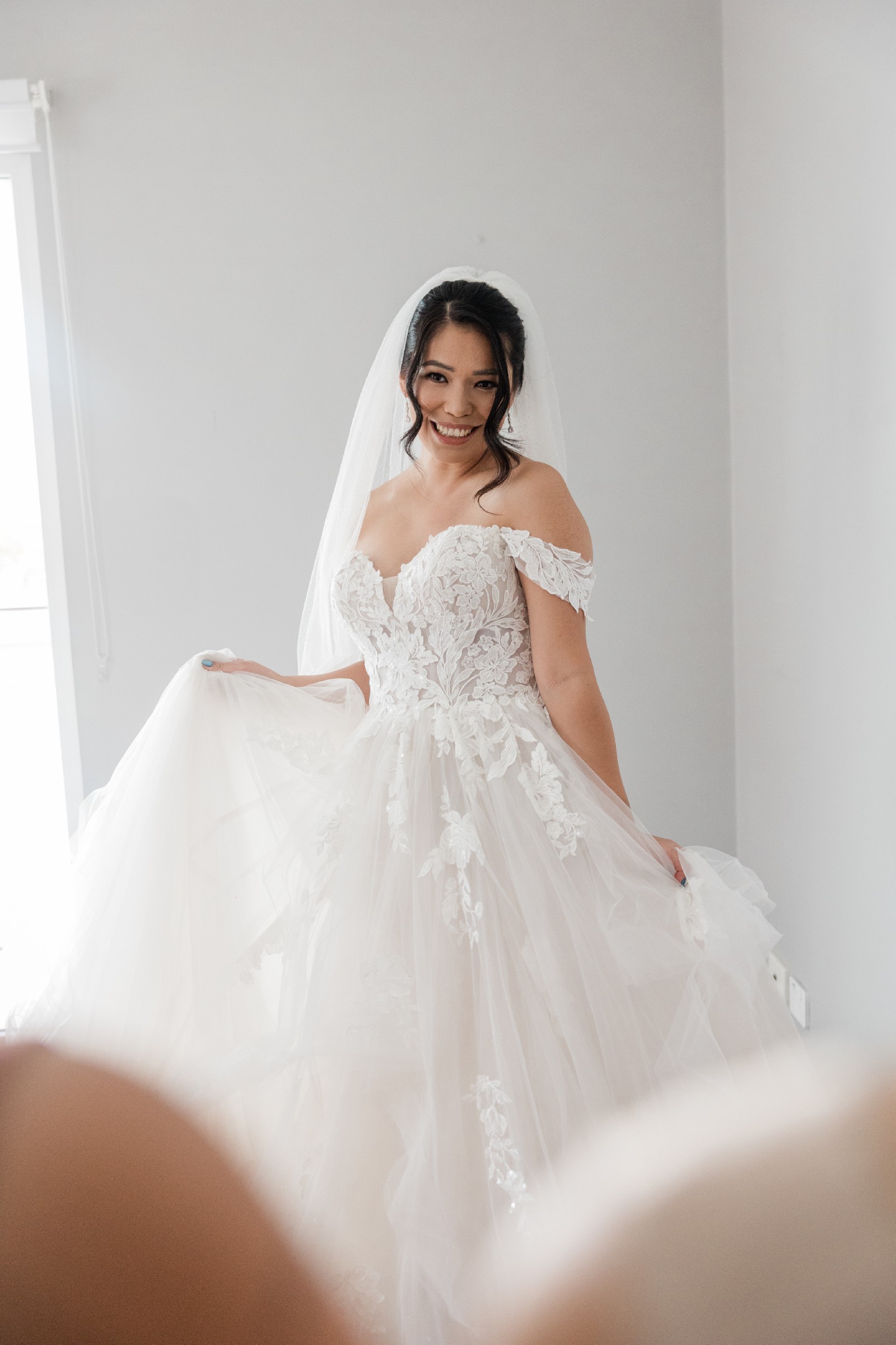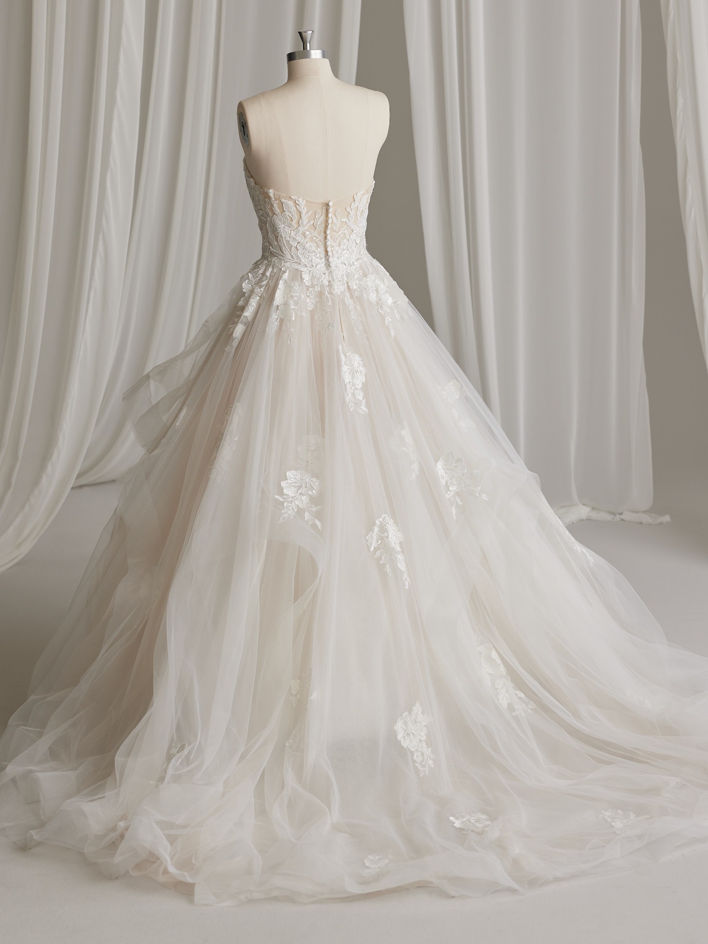 The Maggie Sottero Indiana dress is a princess-inspired, floral, ruffled ballgown bridal dress with a romantic sheer lace train. It features sequin lace motifs over sparkle tulle, a sheer organza-lined bodice with a deep illusion V-neckline, and a sheer lace back with covered buttons over a zipper. The skirt is made of ruffled tulle with a horsehair hem, and the gown includes a sheer lace train. It's designed to make the bride feel like a princess on her wedding day.