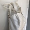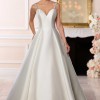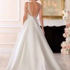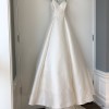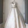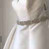 This amazing ballgown mixes classic and modern! A traditional ballgown silhouette in a beautiful ivory Mikado silk, when you turn around your guests will see a modern, glittering back with straps that flatter. A sweetheart neckline frames the face and adds to the classic look.The full skirt isn't overwhelming, and has super fun (and very convenient) pockets! The long train has refined, fabric-covered buttons studding the length. The beaded straps and open back are modern, without being too trendy, and add the perfect finishing touch!