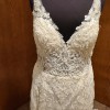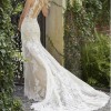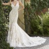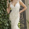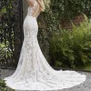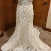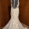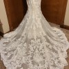 I beautiful gown with moonstone and Clear Crystal Beaded Alençon Lace Appliqués on a Soft Fit and Flare, Tulle Gown. The gown features a with Long, Sheer Train and Wide Scalloped Hemline with Sheer Back Detail. The train is a pretty chapel length.