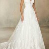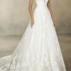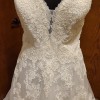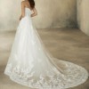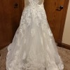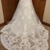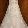 A stunning wedding gown featuring frosted Alençon Lace Appliqués on a Tulle A-Line Gown. The gown is designed with Wide, Border Hemline lace. The chapel length train is gorgeous with the sheerness and highlights the pretty appliques.