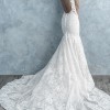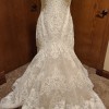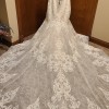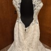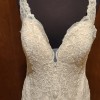 Curve hugging cutouts accent the silhouette of this fit and flare wedding gown. The beautiful v-neck bodice is stunning on any bride. The bodice back is beautifully designed with a pretty keyhole opening. The pretty train is very pretty with the horsehair braid that provides a nice shape on the train.