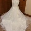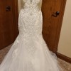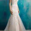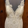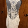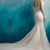 Structured yet soft, this sleeveless gown is delicately beaded and features an illusion neckline and back. The back is very alluring with the design of the lace appliques. The skirt is very pretty with the tulle overlay and lays softly on the lining. A pretty chapel length train finishes this gown.