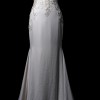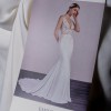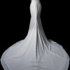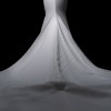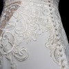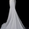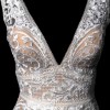 A masterpiece in embroidered lace, this opulent V-neck mermaid gown features glittering French lace motifs along the bust that travel into a checkered, semi-illusion waistband and add texture to a fitted crepe skirt, giving it a distinct rustic and boho wedding dress feel.