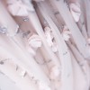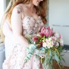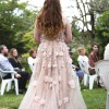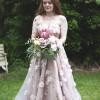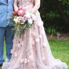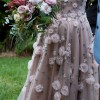 Blush pink wedding dress with hand detailed silver "vines and leaves" beading connecting to 3D tulle flowers with silver beaded centers. Long and flowing with a hemmed skirt to prevent drag.