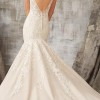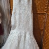 Gorgeous chantilly and Venice Lace Appliques wedding gown. Very couture gown that combines tulle appliques and Edged with Crystal Beading. Very comfortable gown for that confident bride but such a stunning low v-neck back. The gown is finished with a stunning chapel length train.