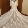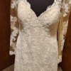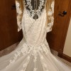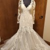 Mermaid all-over lace with gorgeous lace. Beautiful v-neckline bodice is stunning with a nice wide strap. The gown is finished with a pretty chapel length train. The gown is a pretty ivory/nude/ivory color. The gown has gorgeous lace sleeves.