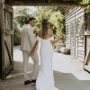 Beautiful Strapless style with ruched bust. Detachable sleeves for ceremony optional.