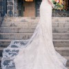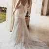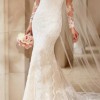 Beautiful ivory and white lace over matte satin long sleeved dress, with sheer back, button detail, short, curved train. Dress trundles to shorten train/pick back of dress off the floor