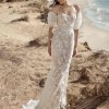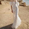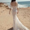 Characterized by dreamy, detachable tulle and and perfectly placed 3D embroidery, this romantic gown features an exquisite mermaid-style silhouette supported by a lightweight corset. Expert draping blends tulle and lace seamlessly together to reveal a second layer underneath and subtly exposed boning.