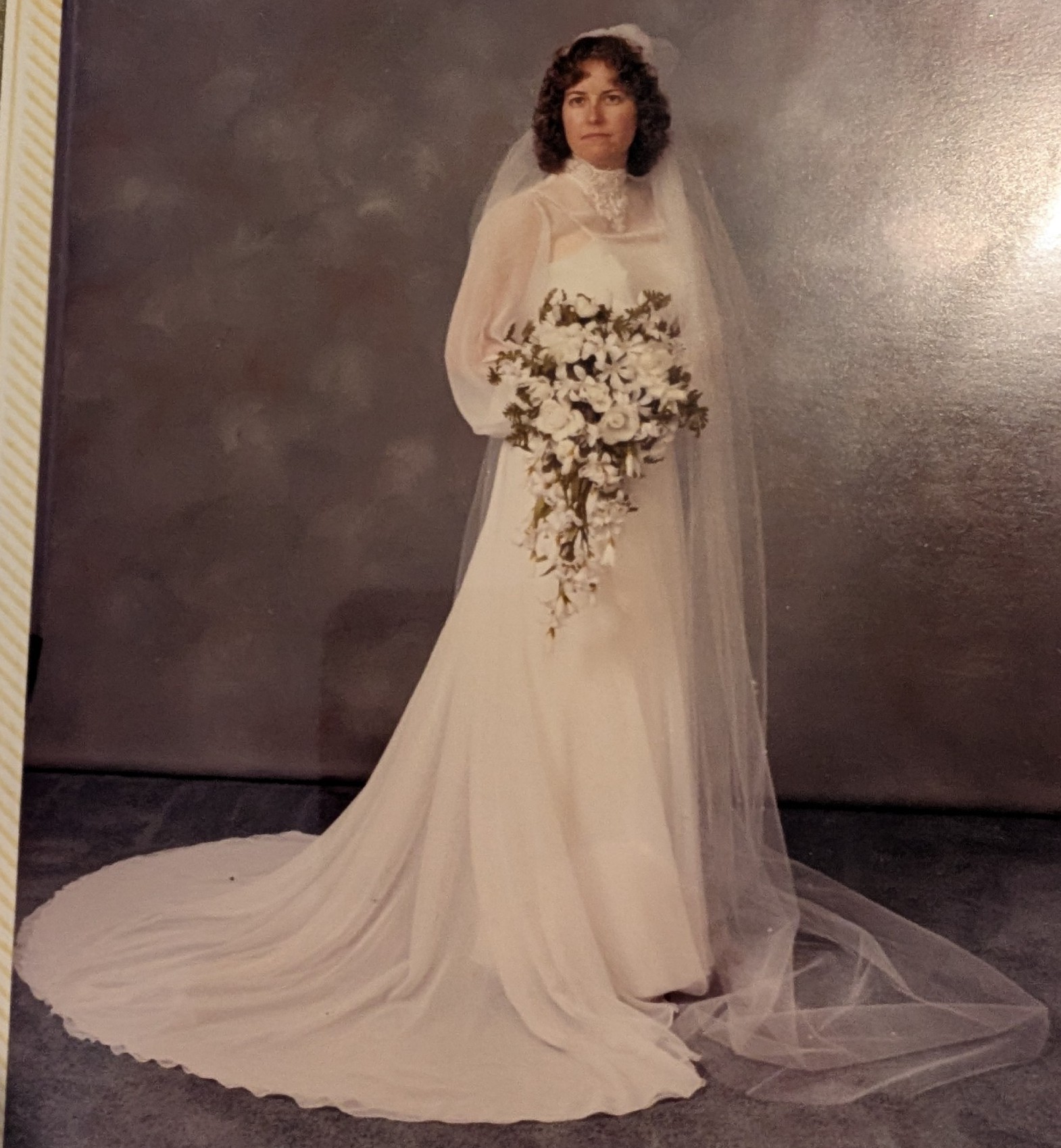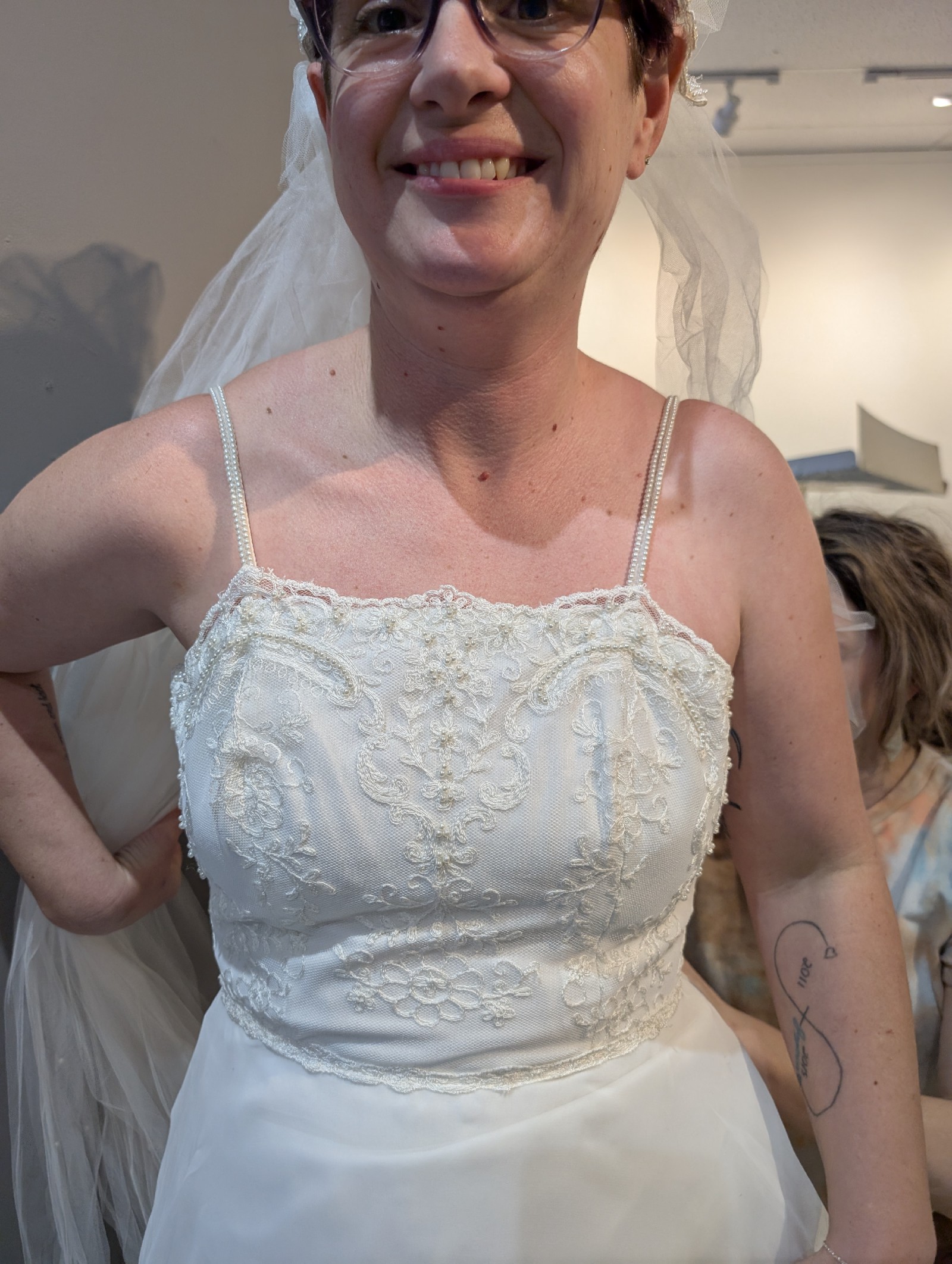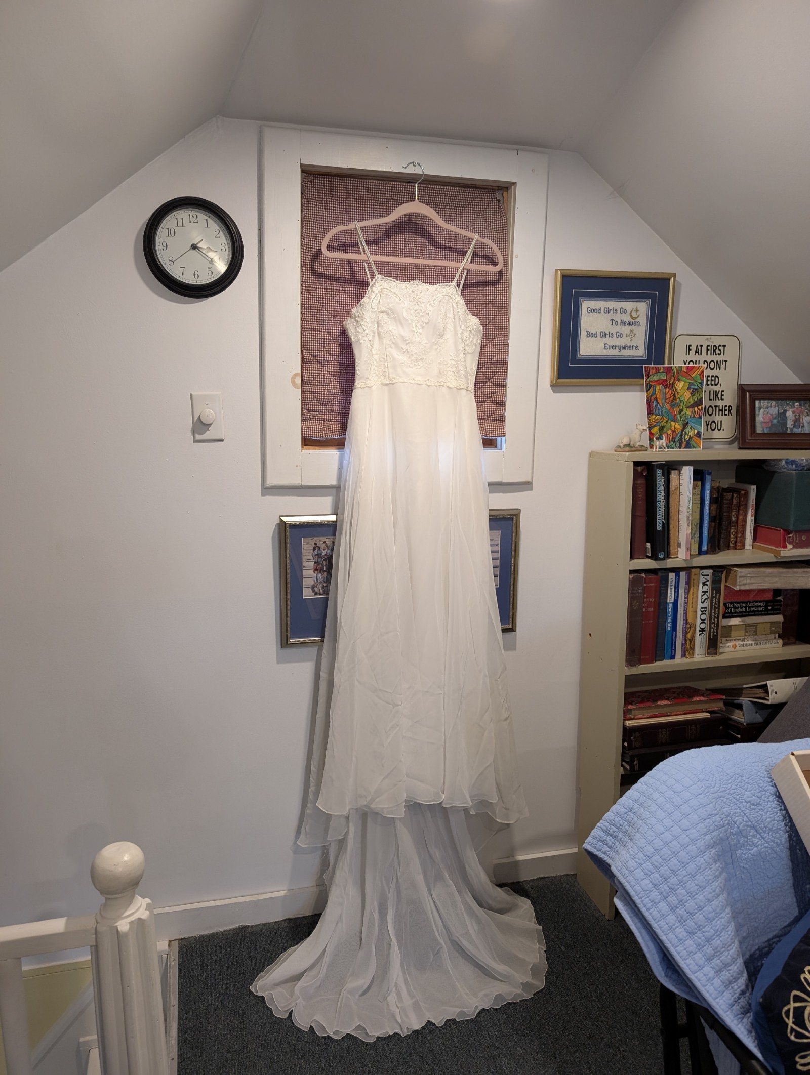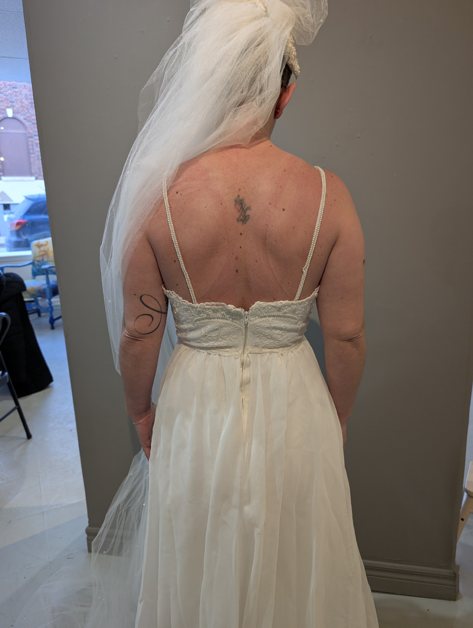 Suki Rosen (Philadelphia, USA) dress from 1982. Dress has pearled spaghetti straps, but there is also an optional overshirt that is embroidered/pearled and has long sleeves with buttons and lace. Dress comes with underslip with 3 layers, including tulle. Dress and headpiece have long trains, but they can be bustled as indicated in picture. There is also an accompanying money bag. Dress was hermetically sealed and only opened this past week (January 2025). Certificates indicating this warranty accompany dress. Only flaws are one missing button on overshirt and one missing hook for an eye. I was 5'2" and wore one inch heels. A great dress for a hot/humid environment. I survived in it on a 95 degree, very humid day.