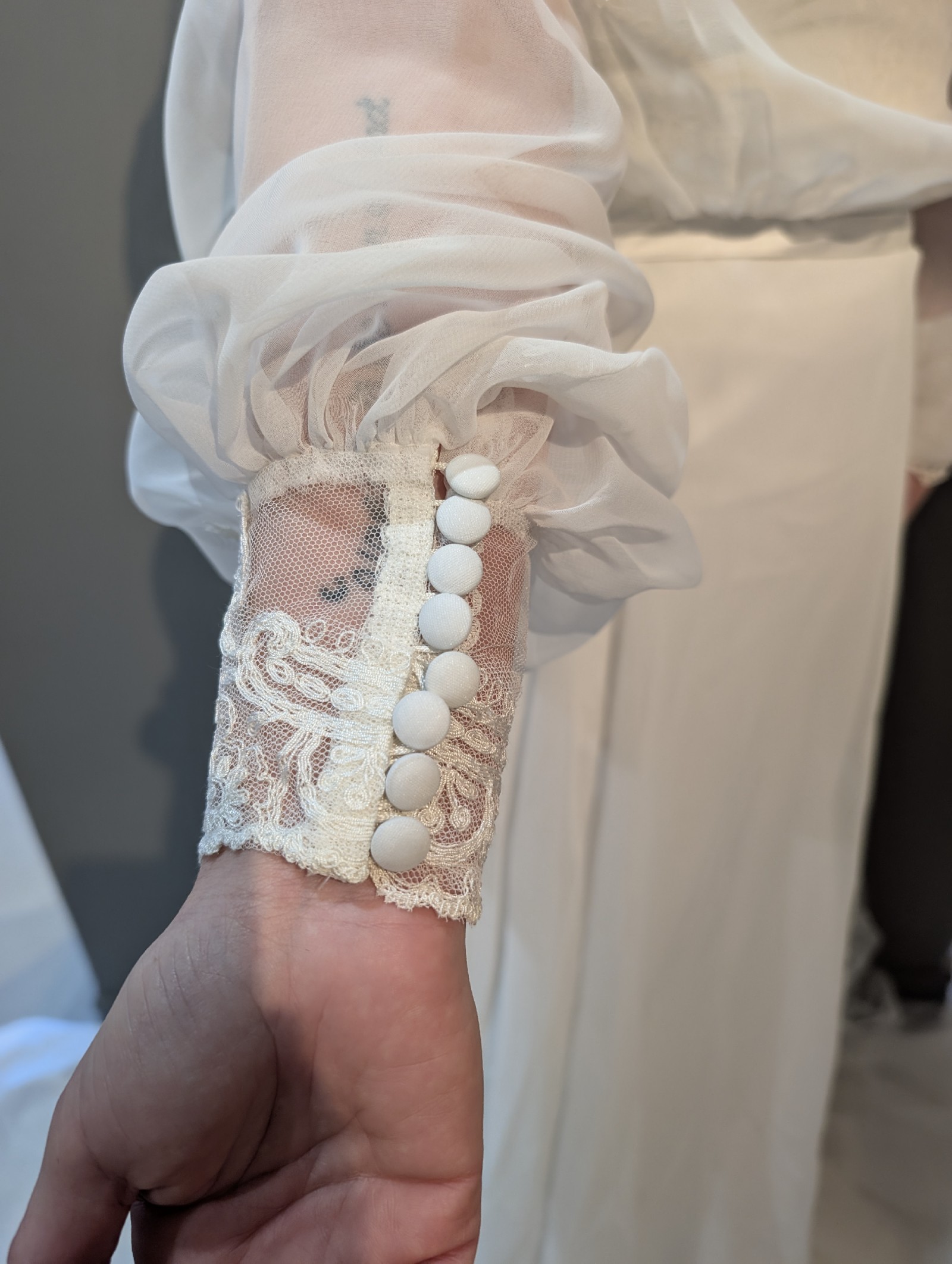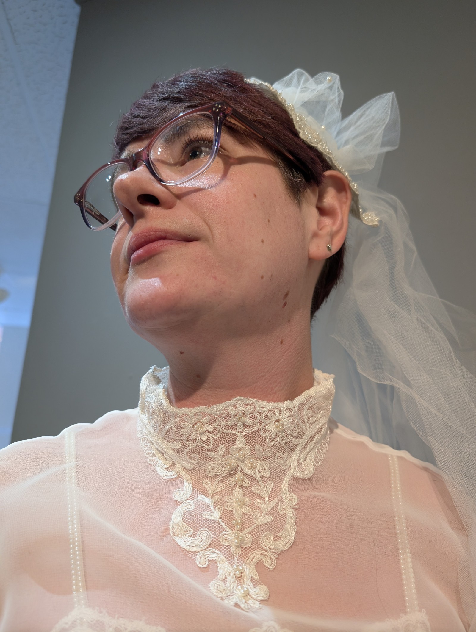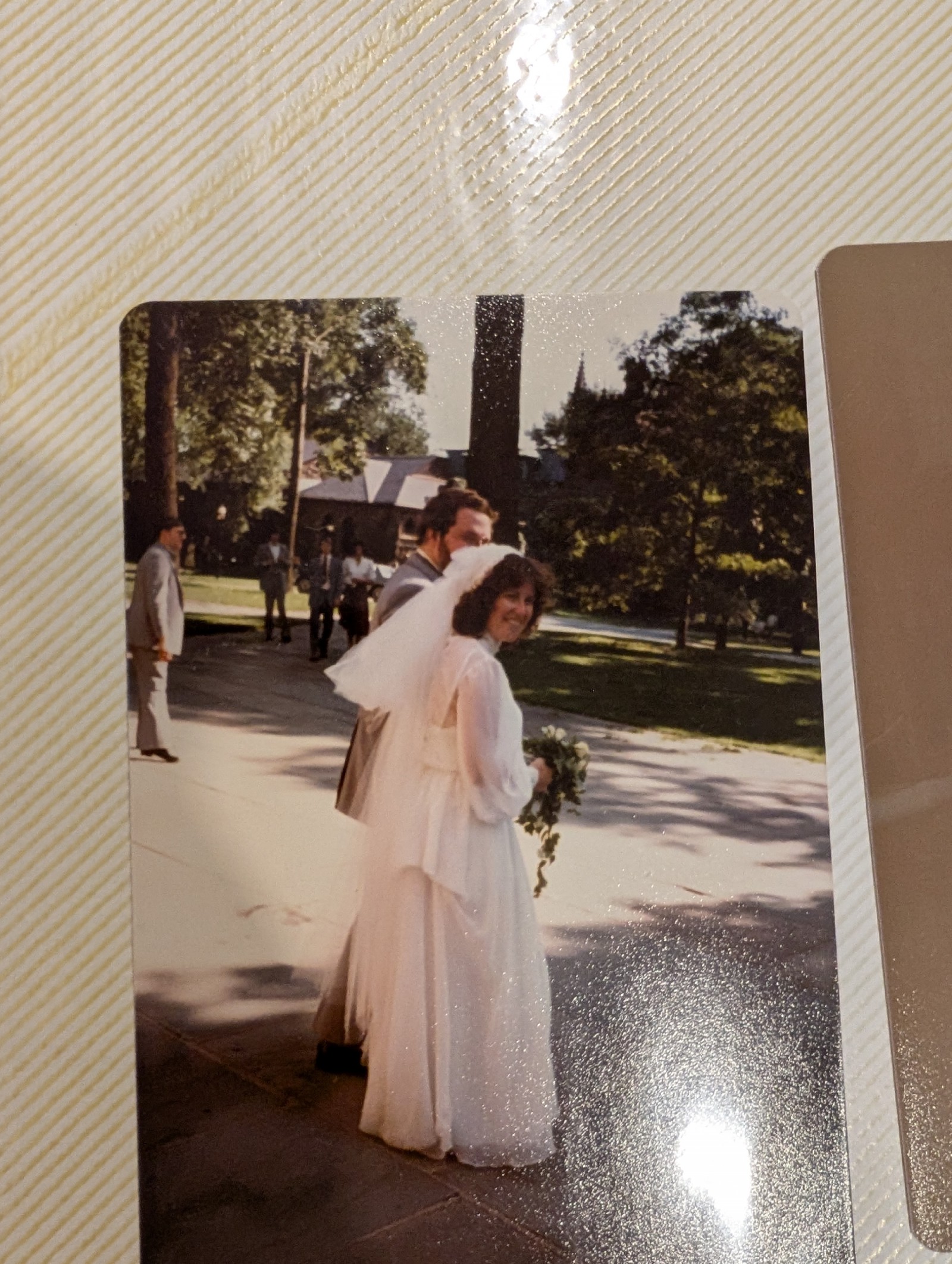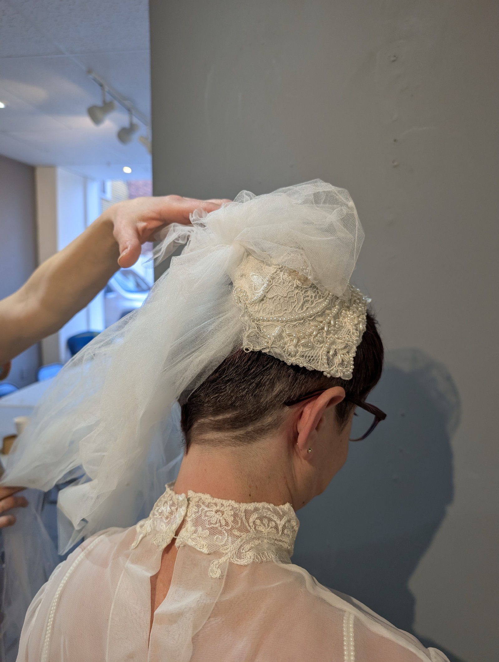Suki Rosen (Philadelphia, USA) dress from 1982. Dress has pearled spaghetti straps, but there is also an optional overshirt that is embroidered/pearled and has long sleeves with buttons and lace. Dress comes with underslip with 3 layers, including tulle. Dress and headpiece have long trains, but they can be bustled as indicated in picture. There is also an accompanying money bag. Dress was hermetically sealed and only opened this past week (January 2025). Certificates indicating this warranty accompany dress. Only flaws are one missing button on overshirt and one missing hook for an eye. I was 5'2" and wore one inch heels. A great dress for a hot/humid environment. I survived in it on a 95 degree, very humid day.
