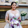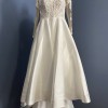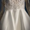 This beautiful Allure ball gown has a sweetheart neckline with a sheer torso and sleeves with floral/leafy design; which continues on the back with a key hole design. The bottom half is a clean satiny floor length skirt. It does have a long train with buttons running down the middle; the same buttons close off the bottom of the full length sleeves. It also has pockets! Recommended for any bride going for a modern day beautiful, royal and classy look. It has been recently dry cleaned, and has no stains or flaws.