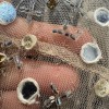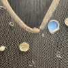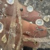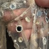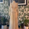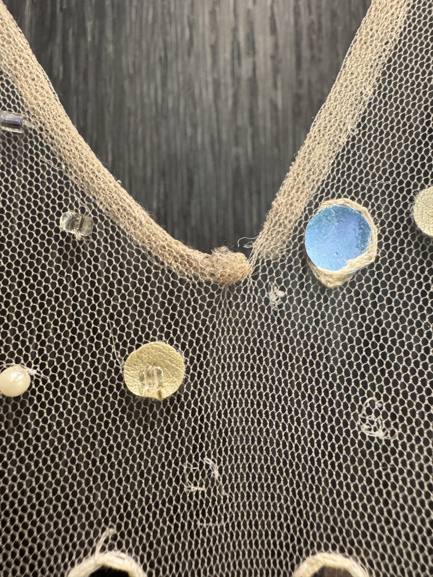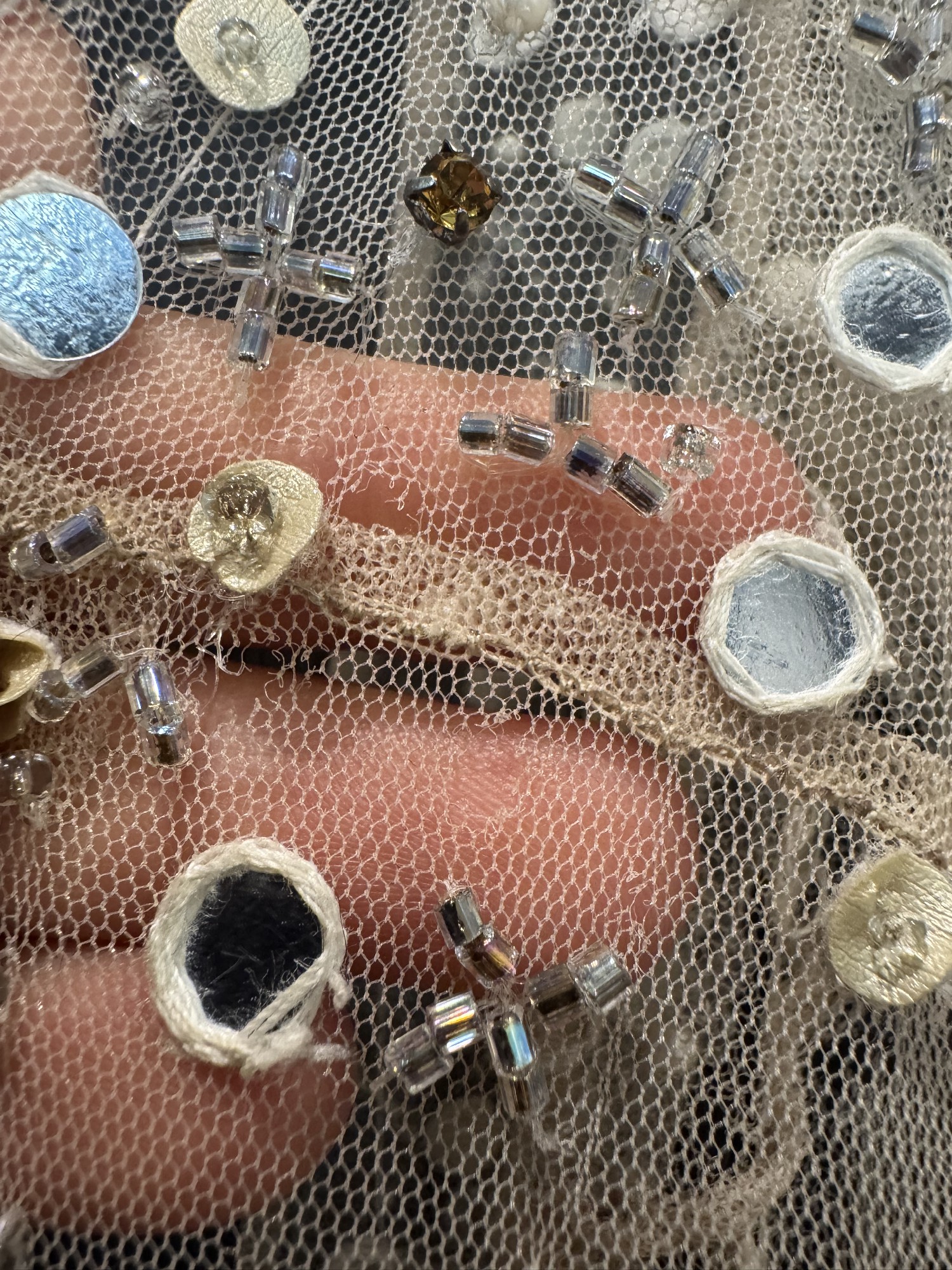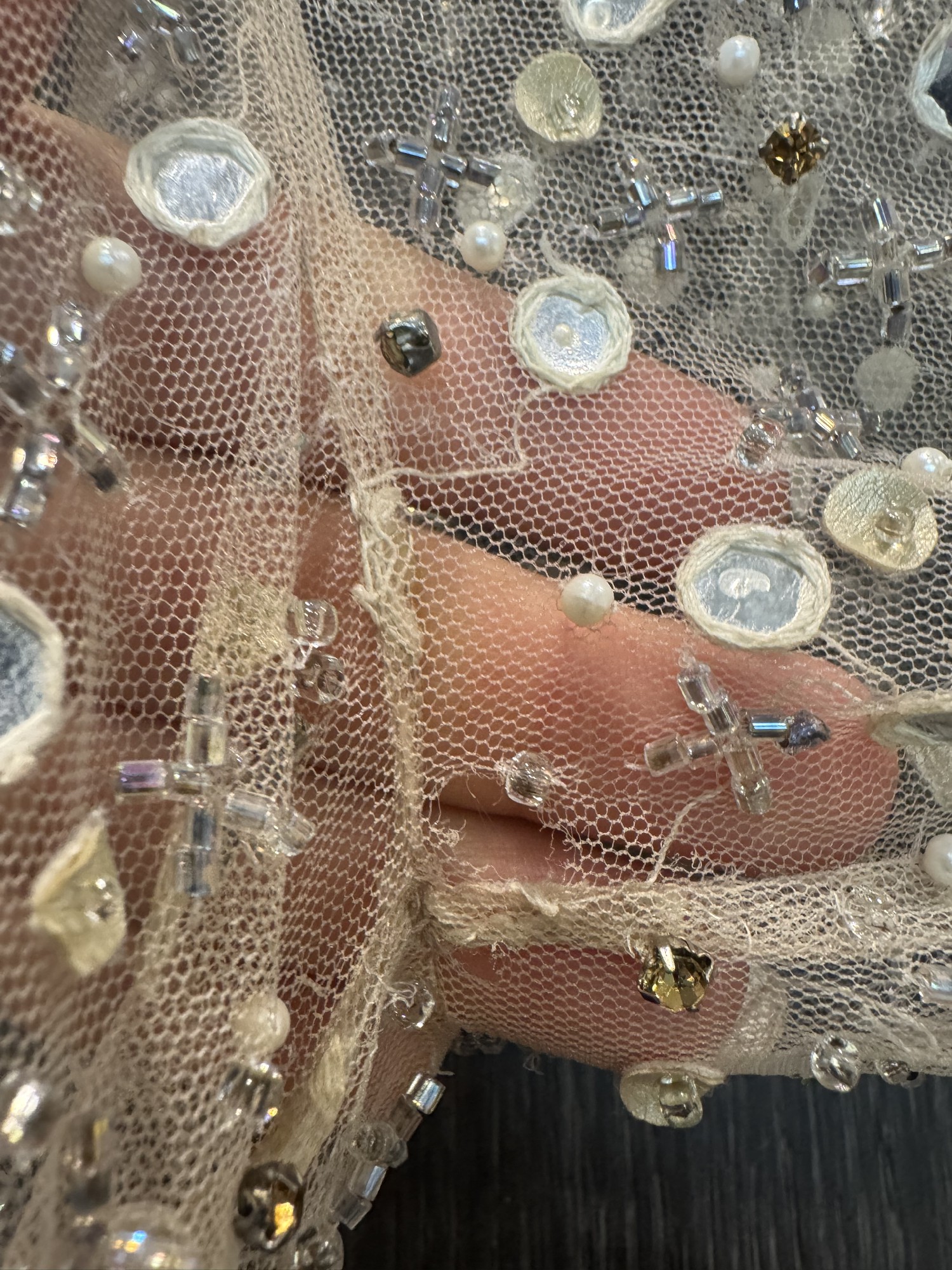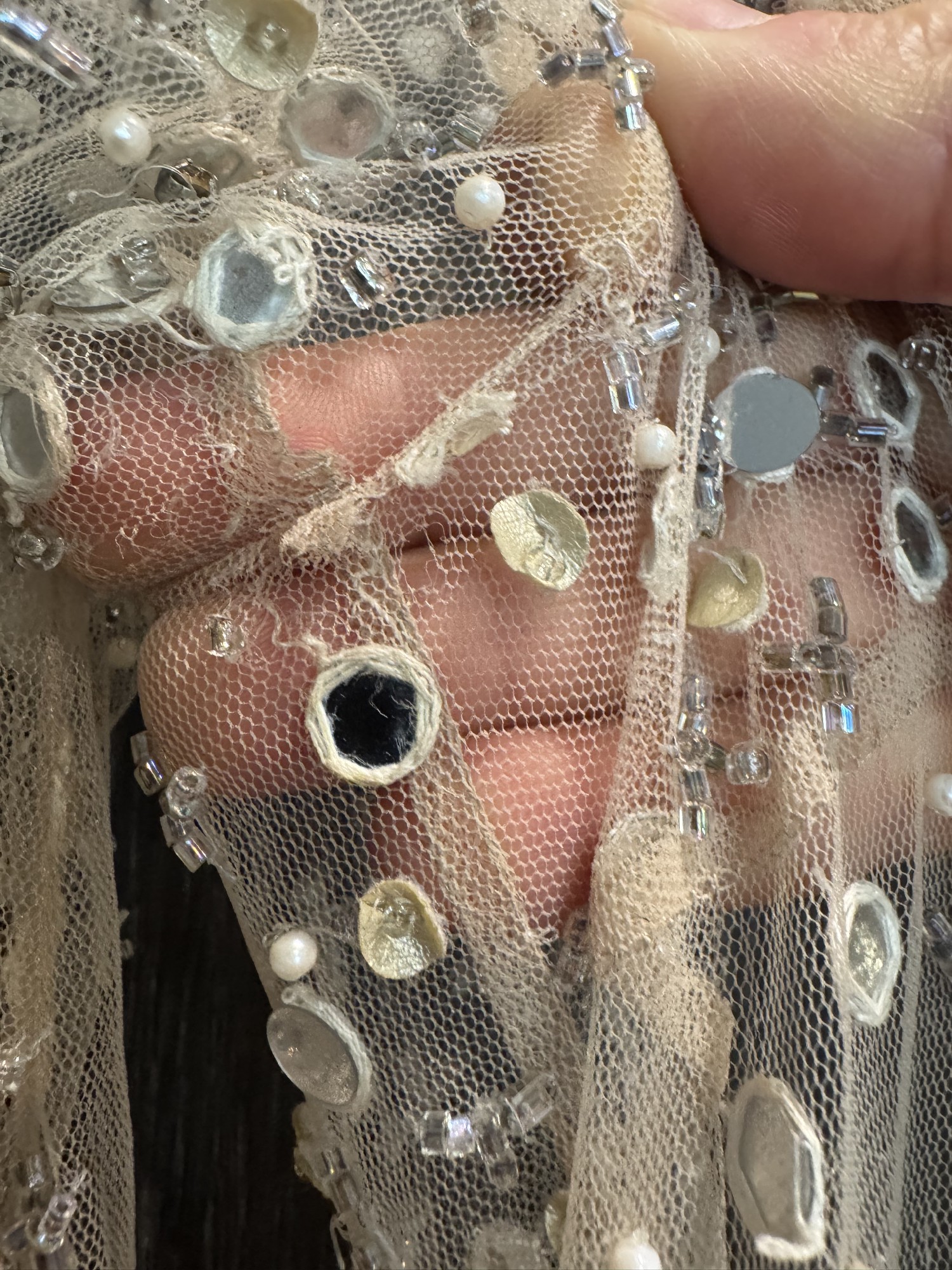 Please know there are tiny holes in quite a few areas (honestly no noticeable when wearing) and a small tear at neckline. Last 4 photos show wear. I also have extra material from when I had it shortened in the front so any good tailor can add more beads from it and mend the small tear in front and disguise/cover the holes.