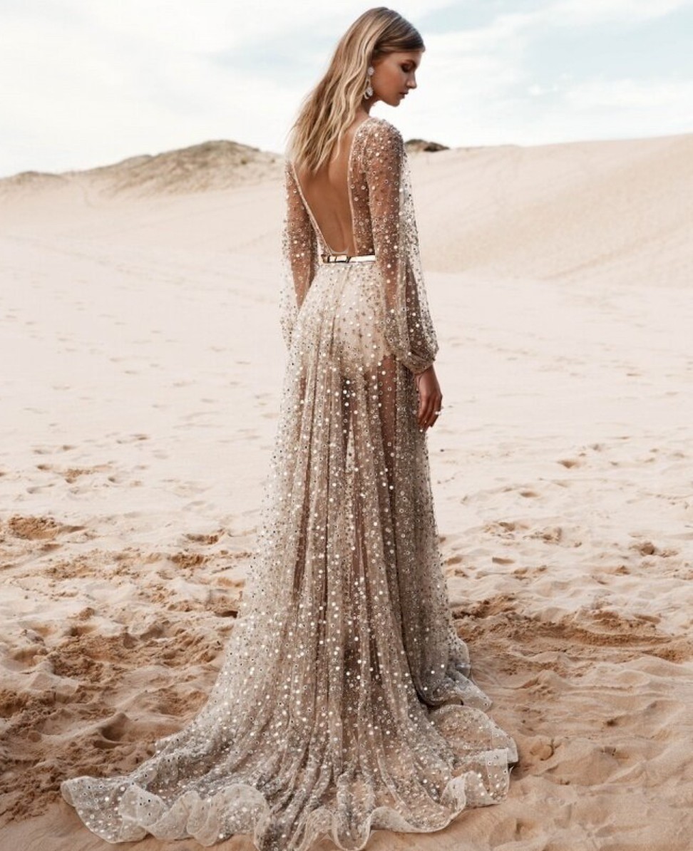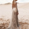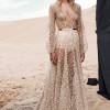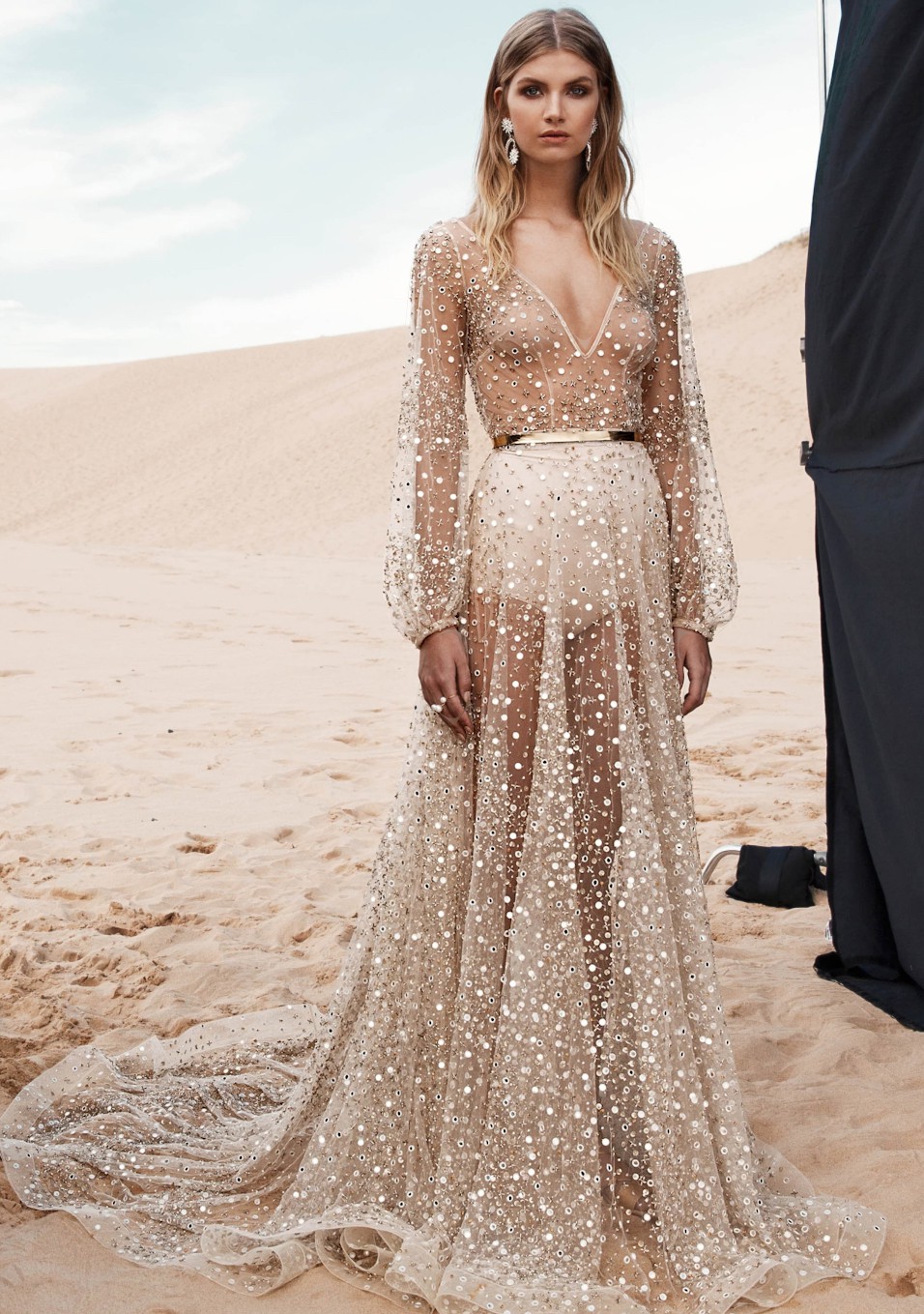 Crafted from delicate tulle, the dress is adorned with exquisite beading, crystals, and pearls that catch the light and shimmer with every step. The long sleeves offer a graceful balance, making it perfect for any season. The floor-length hem glides with a captivating grace, perfect for gliding down the aisle.
