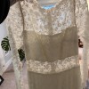 Under the embroidered mesh, it's double lined with a thick silky fabric and then two layers of tulle with the slightest blue tint. This runs big for a size 4, as I'm usually a 6/8. Comes in the original BHLDN garment bag & I'm open to offers!