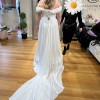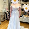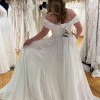 Channel your inner goddess in Style D4087, a flowy Greek goddess wedding dress in luxurious chiffon. The soft A-line chiffon wedding gown features a draped strapless bodice with a pearl-embellished sweetheart neckline at the bust as detachable off-the-shoulder long sleeves are scattered with pearl bead accents at the top before billowing out into pillowy blouson sleeves and gathering at the wrist. Luxe layers fall from the waistline and open into a high leg slit, adding flowing movement with every step. For the modern goddess bride, this chiffon wedding gown with sleeves is a romantic vision down the aisle.