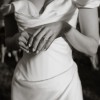 The Eclipse offers an A-line silhouette with high leg slit and flowing train. A plunging sweetheart neckline is created with sweeping fabric twisted across the shoulders and tied with a ribbon to accentuate the bust, on a flattering longline corset. Made in a pearl white FSC-certified crepe satin, the gown features asymmetric draping on the hips, with a sensual deep scoop back.