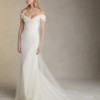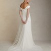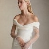 Stretch cady off the shoulder gown with draped bodice detail. Soft tulle overlay extends from neckline. Invisible zip closure at center back. New with tags and DF fabric gown cover.