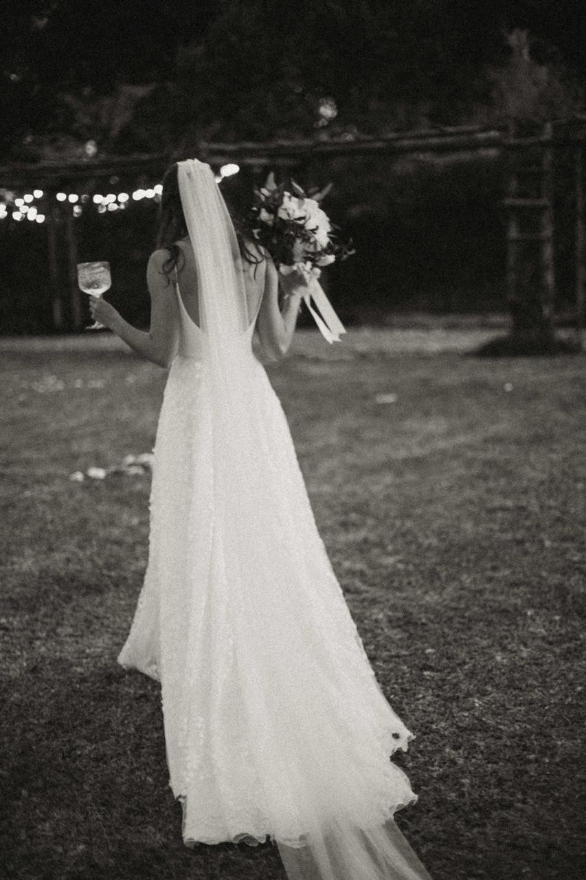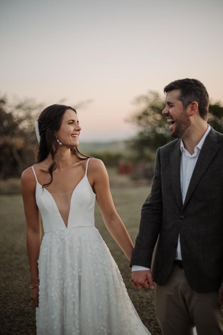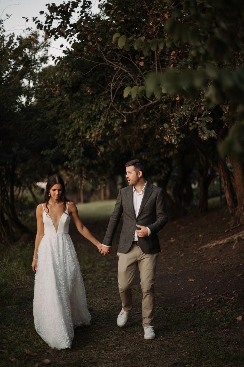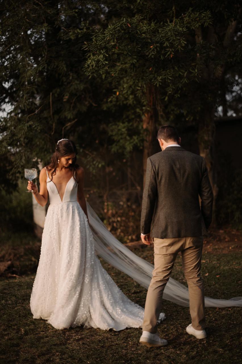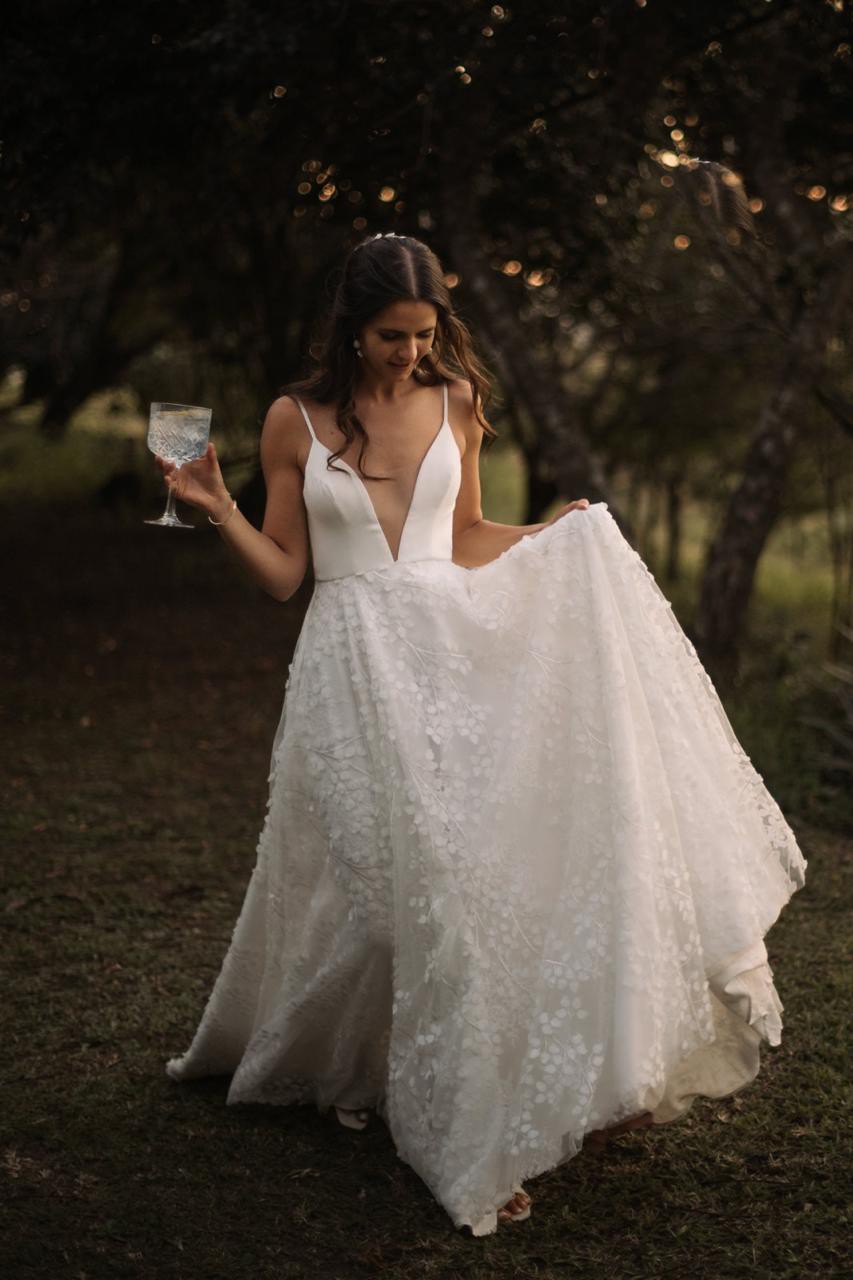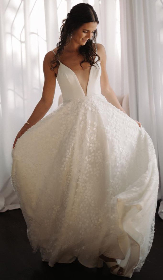 BESPOKE HUNTER GOWN IN MODERN STRETCH WITH 3D LEAFY LACE A-LINE SKIRT