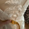 - Bustle added, white panel added to front of dress to make less sheer, bra cups added, embroidered flowers added to side to make more modest