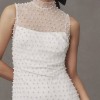Beautiful gown dripping in pearls. The mesh, pearl covered layer can be worn separately from the slip underneath. Size 14, but definitely can fit smaller or larger. The material is stretchy and comfortable. Wore this once for about 30 minutes and then had it dry cleaned. There is one small hole on the back left shoulder of the mesh layer and there may be a couple pearls missing, but neither is really noticeable when the dress is on.