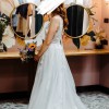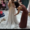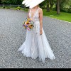 There were no alterations made to this dress for size or length. On the under layer of the dress there a a few small snags (due to the fabric) but when it is on you cannot see these. Would happily let someone come and try it on. The dress colour is 'titanium' - the under layer has a greyish tint to it and the velvet ribbon ties are that colour too. The top layer is white with white flowers.