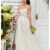 It has a sweetheart neckline, a long flowing skirt, and is made of soft ivory silk. The low back and strapless design make it feel graceful. The skirt has pretty 3D flowers that make it stand out.