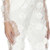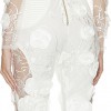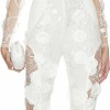This exquisite Zhivago jumpsuit features a plunging V-neckline and long sheer lace sleeves with a delicate floral pattern. The fitted bodice and hips elegantly transition into flared legs, creating a sophisticated silhouette perfect for formal occasions.