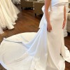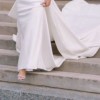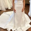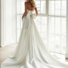 Beautiful wedding gown with a fabulous detachable train. A strapless bodice is decorated with a falbala that highlights a decollete. Extra-low bodice bares a bride’s back. A fantastic removable skirt is embellished with a big bow and passes into a long train. Dress has been professionally dry cleaned.