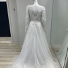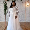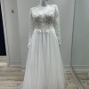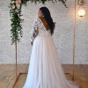 Lace and tulle a-line wedding gown, with delicate sequin embellishments and long sleeves.