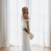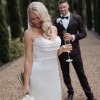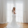 The Greer gown is crafted in Satin fabric creating a soft sheen all over. Greer features a fitted skirt and an expertly draped bodice with exposed boning that contours the waist creating an overall hourglass silhouette. Greer can be worn as a strapless or with detachable off the shoulder draped sleeves for a romantic touch. Greer is complete and adorned with a row of fabric cover buttons down the back zip.