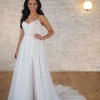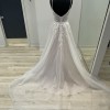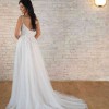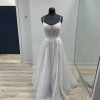 Spaghetti strap V-neck glitter tulle and lace A-line wedding gown with front slit. No belt available with dress.