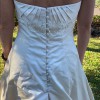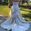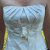This strapless A-line Monique Lhuillier gown has exquisite lace and ribbon empire detail. Beautiful silk buttons down the back lead to a gathered bolero. This dress was never worn except to try on and take these photos.