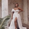 Teddi is a stunning balance of volume and airiness, crafted in textured taffeta with a soft neckline, structured bodice, asymmetric arm band, and an elegant split in the skirt. The full skirt and draped details give it a truly modern yet romantic feel.