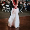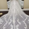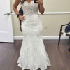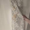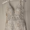 Worn once, this dress has not been dry cleaned and does have a few light stains from the wedding day—mostly along the hem and train, and a few on the torso area. These should come out with professional cleaning. The overall structure and beauty of the gown remain intact.