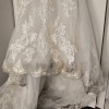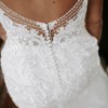 This gorgeous Essense of Australia D2771 gown combines romantic lace with a flattering fit-and-flare silhouette. It features delicate lace straps, a plunging neckline, and a sheer back with fabric-covered buttons that flow into a dramatic train. The perfect mix of timeless and modern bridal style!