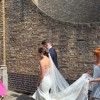 There is always drama in the back with bridal buttons falling from the back bodice to mid skirt.