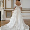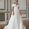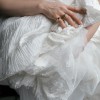 The Farrow gown feels like a modern fairy tale. Cut in our beautifully textured crinkle habotai, she features a notched sweetheart neckline and a flattering angled cummerbund waist. Dramatic off the shoulder sleeves are draped out of the neckline, and the gathered ball skirt has beautiful movement. Covered buttons to the hem add a classic bridal finish.