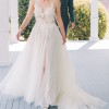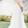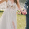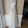 This beautiful gown is perfect for a garden themed wedding or bohemian bride. It's an A-line gown that fits snuggly on top, hugging and complimenting your curves, with a soft flowing tulle skirt. It is light, easy to dance and move in, and gives hints of sexy with the open back and slit in the skirt. It has an illusion neckline, with stunning embroidery creating the bodice with beautiful, sunglow colors at the heart of each flower for a subtle touch of color.