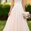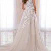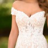 Say “yes” to natural beauty with this organic-inspired masterpiece! Lively, vine-like laces become the focal point of this feminine A-line silhouette, featuring off-shoulder sleeves and a subtle sweetheart neckline for a highlighted décolletage. A completely matte look, fashion-forward brides will love the simplicity and comfortable wearability of the silhouette, featuring a slightly sheer bodice underneath the gently cascading leaves—falling at varying lengths below the waist an onto the full A-line skirt of layered tulle. This gown features a shorter, manageable train to maintain volume and weightlessness to the overall design, and zips beneath fabric-covered buttons. Colour described as ivory or moscato.