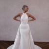 Grayson’s timeless and classic, fitted silhouette is taken to a new level by pairing the gown with the matching full crepe removable skirt for a touch of added glamour. This pairing provides the perfect balance of drama to walk down the aisle and a sleek fitted style for the celebrations to follow.