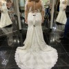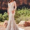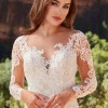 The sheer neckline and long sleeves create an ethereal quality, while the sheer back adds an element of surprise and sophistication, allowing for beautiful glimpses of skin beneath the detailed lace. Designed to enhance your natural beauty, this floor-length dress will make you feel truly radiant on your special day.