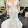 The Dress is New and never worn or fitted! This exquisite fit and flare wedding dress is a stunning embodiment of elegance and romance. Crafted in an enchanting ivory lace, it gracefully hugs your curves before flaring out into a soft skirt that creates a mesmerizing silhouette as you walk down the aisle. The intricate embroidery throughout adds a delicate touch of artistry, making this gown perfect for the bride who desires a unique and timeless look.