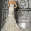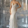 This slim, fit and flare wedding dress features frosted, embroidered appliques with wide scalloped hemline and sheer boned bodice. The delicate lace is finished with silver stitching.
