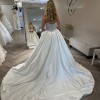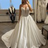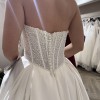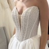 The Maggie Sottero "Tina" wedding dress is a couture-inspired ball gown, that embodies elegance and romance. It's known for its dramatic pearl basque waist, which creates a unique silhouette. The dress is crafted from luxurious satin, featuring a strapless plunging illusion neckline and a flattering basque waist.