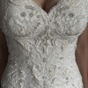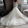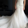 The dress is stunning, it is figure hugging, shapely and very feminine. As you can see from the photos the bodice is made from a baroque lace and lattice fabric, the bottom of the dress is tulle and it has a chapel train. The colour of the dress is ivory in a UK size 8.