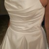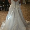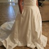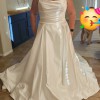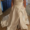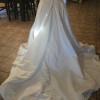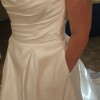 New and unaltered cathedral length, satin, IVORY, A-line wedding gown. Fitted with boning bust, pockets, high slit and buttons down the full length of the back.