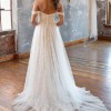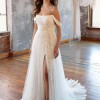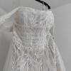 The Noele gown is a stunning blend of modern boho style and romantic bridal design. Wrapped in soft sheer tulle, its A-line silhouette is covered in unique leafy embroidered lace. The strapless bodice features a curved square neckline with detachable off-the-shoulder straps for added versatility. A high slit in the skirt peeks through layers of gathered tulle, flowing into a sweeping train.